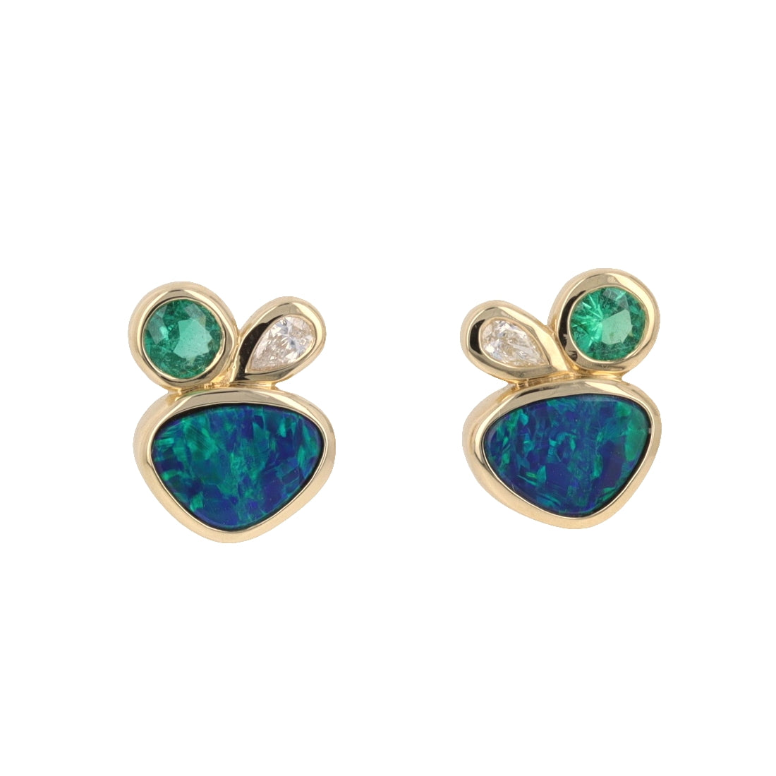 The Gemstone Cluster Stud Style Earrings Feature a Round Emerald, a Pear Shaped White Natural Diamond and an Organically Shaped Opal. All Set in 18 Karat Yellow Gold with a Satin Finish, the Gemstones Pop with Color.