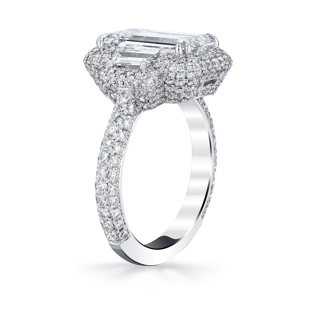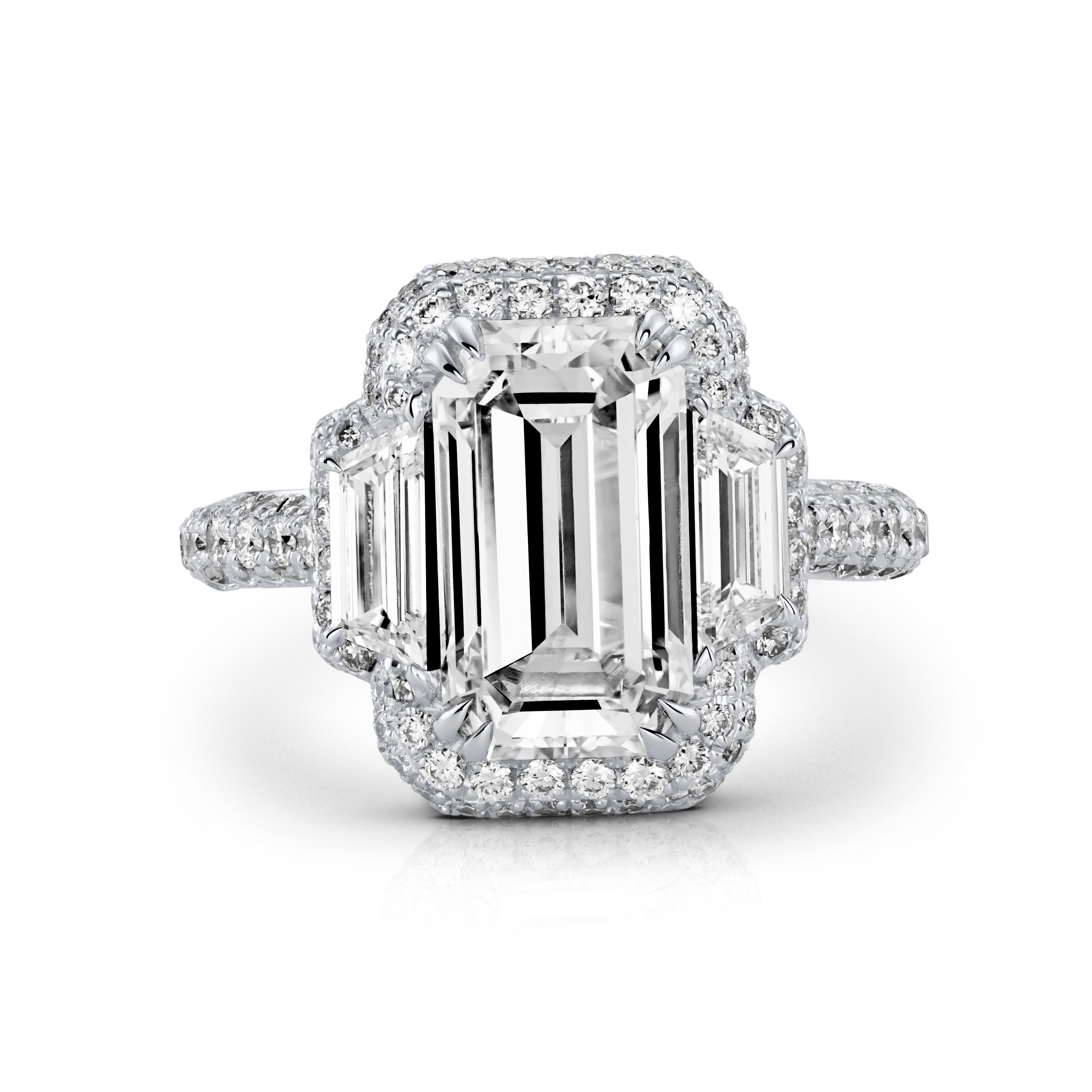 Take Center Stage with this Breathtaking Platinum Emerald Cut, 3.75 Carat Diamond Ring with Trapezoid and Round Accenting Diamonds.