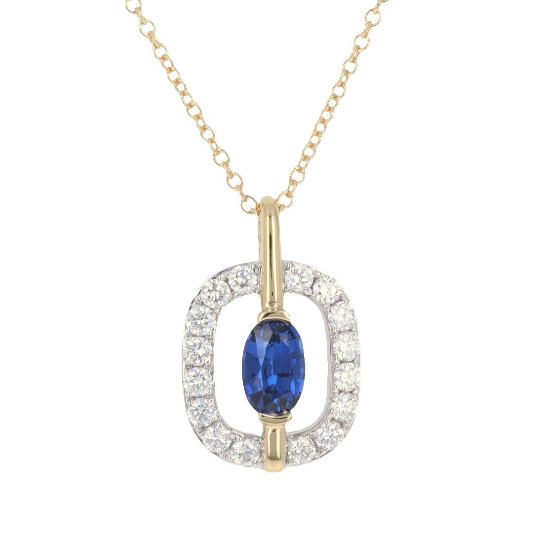 18Ktt Sapphire And Diamond Pendant Featuring One Oval Sapphire Channel Set In Yellow Gold With A White Gold And 16 Diamond Frame. The Diamonds Have A Total Carat Weight Of .32. The Sapphire Has A Carat Weight Of .60