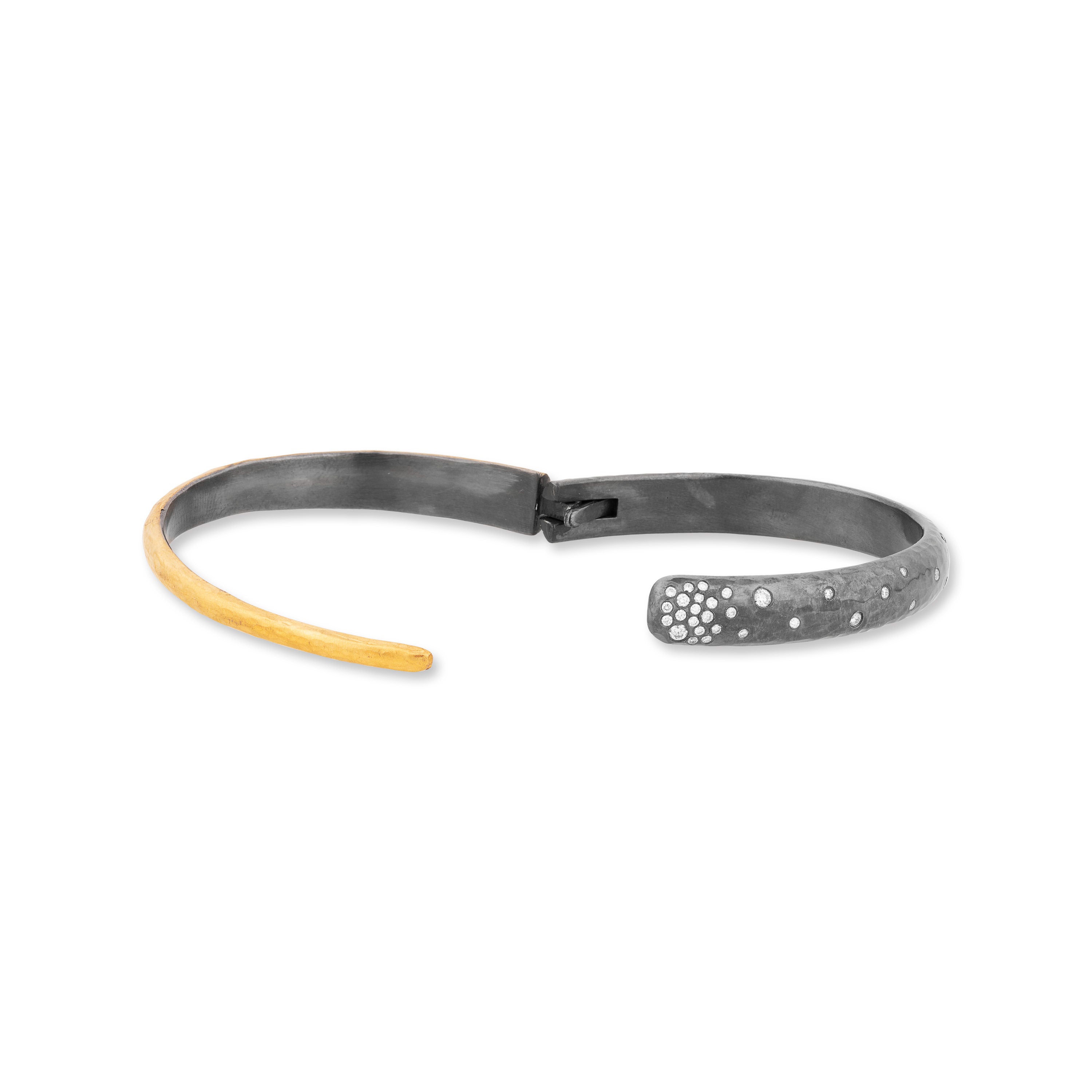 The 'Midnight Wrap' Bracelet Features a Hinge at the Back for Easy Opening & Closing. The Mix of Oxidized Silver and 24 Karat Fusion Gold Make the Gypsy Set White Diamonds Pop with Sparkle.